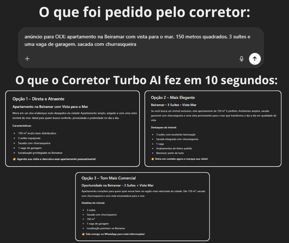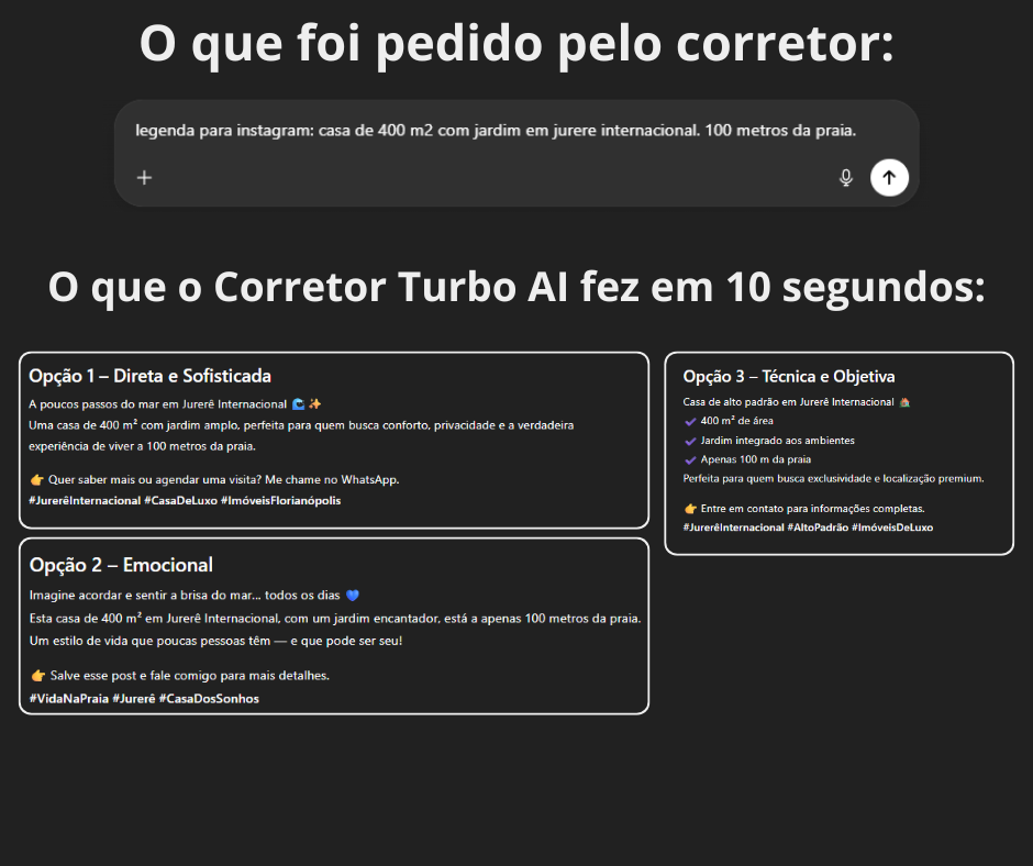 O Corretor Turbo IA transforma poucos dados em textos completos e profissionais, prontos para publicar nos portais de imóveis, Instagram, WhatsApp e até nos seus anúncios pagos.